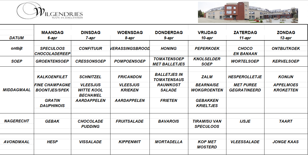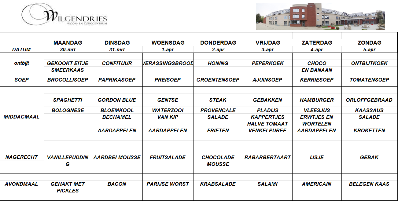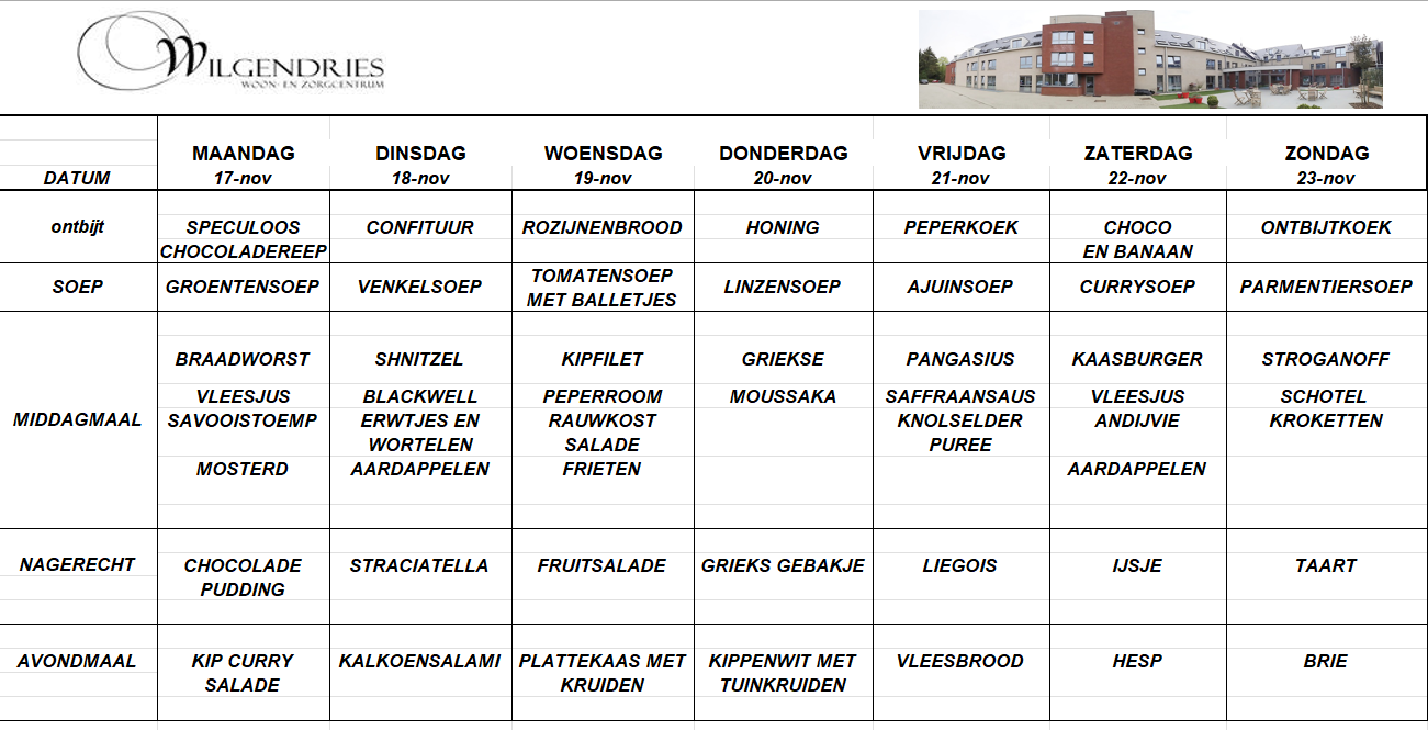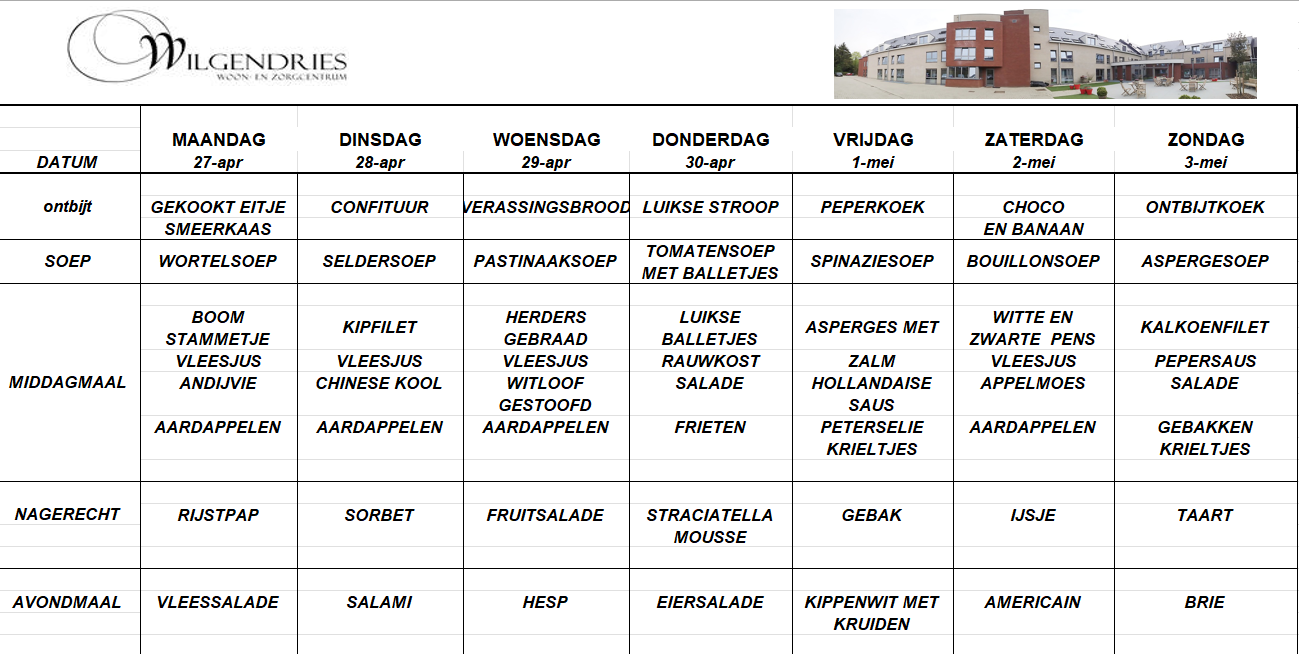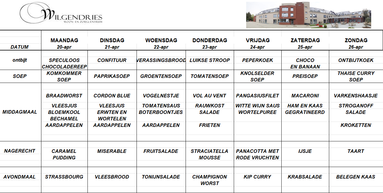 Hier vind je een weekoverzicht van onze lekkere aangepaste keuken. Smakelijk!
